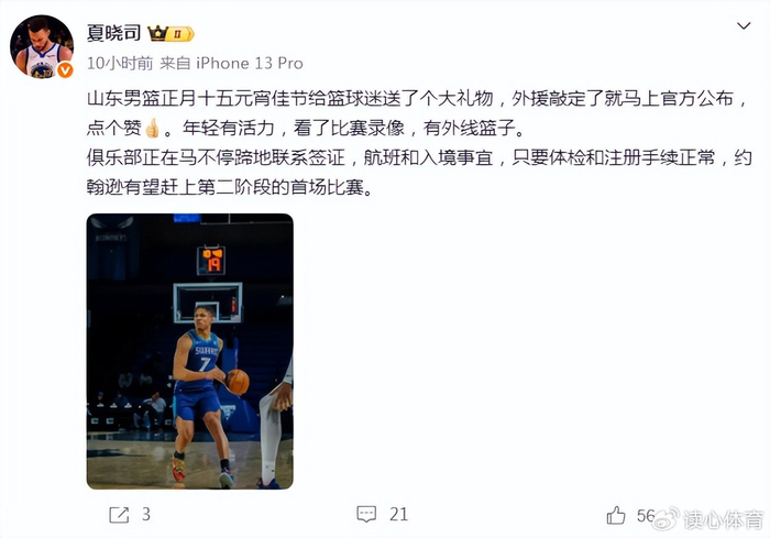 随着正月十五元宵节的到来,高速俱乐部也给球迷带来了好消息,山东高速已正式签下了1米95后卫基昂泰-约翰逊,目前俱乐部相关工作人员正在安排其办理签证及入境手续,能赶上第二阶段联赛首战。据跟队记者夏晓司透露,高速俱乐部与基昂泰-约翰逊就合同问题拉扯近两周,直至签约前的一天还在不断修改合同细节,邱彪指导甚至一度以为无法签下基昂泰-约翰逊,另外敲定了备用外援人选,最终好事多磨,基昂泰-约翰逊还是在山东高速给出的合同上签字。如今外线有了基昂泰-约翰逊与珀塞尔轮换,内线有克里斯与琼斯护框,少赛1场暂排第五的山东高速第二阶段将朝着更高目标发起冲击。